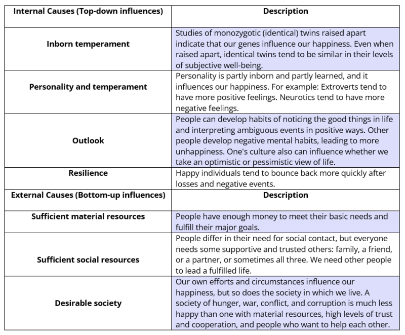 In the table below are shown internal and external circumstances that influence happiness. There are individual differences in what makes people happy, but the causes in the table are important for most people (Diener, Suh, Lucas, & Smith, 1999; Lyubomirsky, 2013; Myers, 1992).
